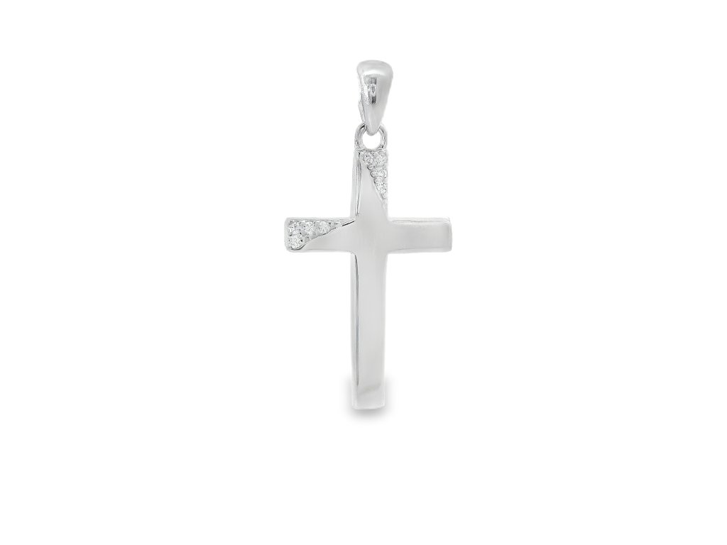 Strieborný prívesok krížik s rhódiom a zirkónmi – čistota tvaru, sila symbolu
