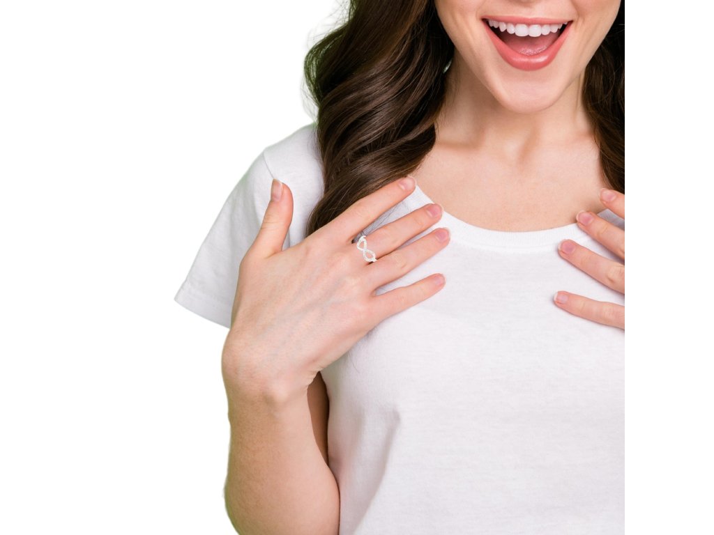 Tento model neobsahuje žiadne osadené kamene – jeho sila spočíva v čistote tvaru a symbolike dizajnu. Absencia zirkónov alebo diamantov mu dodáva ľahkosť a univerzálnosť. Hladký kovový povrch pôsobí elegantne a sústredí pozornosť na samotný symbol ∞. Je to ideálny prsteň pre ženy, ktoré uprednostňujú jemnú eleganciu pred okázalosťou. Čisté línie zároveň zaručujú, že sa hodí ku každému outfitu aj iným šperkom.
