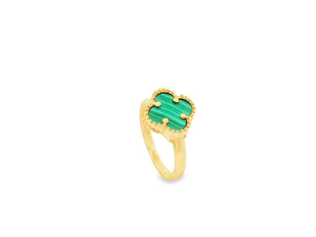 Hlavným prvkom prsteňa je prírodný malachit – kameň s charakteristickými zelenými pásikmi. Každý malachit je originál, takže máte istotu, že váš šperk je absolútne jedinečný. Kameň je brúsený do tvaru štvorlístka, čo symbolizuje šťastie, ochranu a rovnováhu. Vďaka svojej výraznej farbe a textúre patrí malachit medzi najobľúbenejšie dekoračné kamene v luxusnej bižutérii aj zlatníctve.