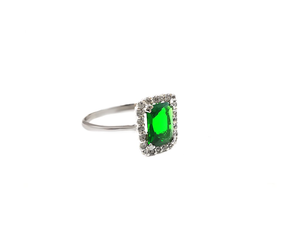 Dominantou prsteňa je syntetický zelený kameň, pravdepodobne napodobňujúci smaragd, s výbrusom v štýle „emerald cut“. Okolo neho sa v symetrickom ráme nachádzajú malé číre syntetické zirkóny, ktoré dodávajú šperku žiarivý akcent. Vďaka kombinácii farieb pôsobí šperk žensky, noblesne a zároveň sviežo. Syntetické kamene sú obľúbenou voľbou pre svoju brilantnosť, bezchybný vzhľad a priaznivejšiu cenu.