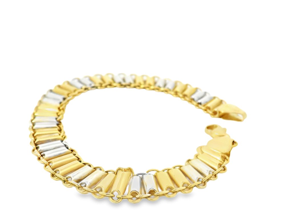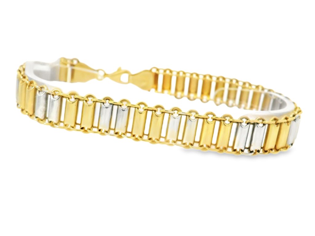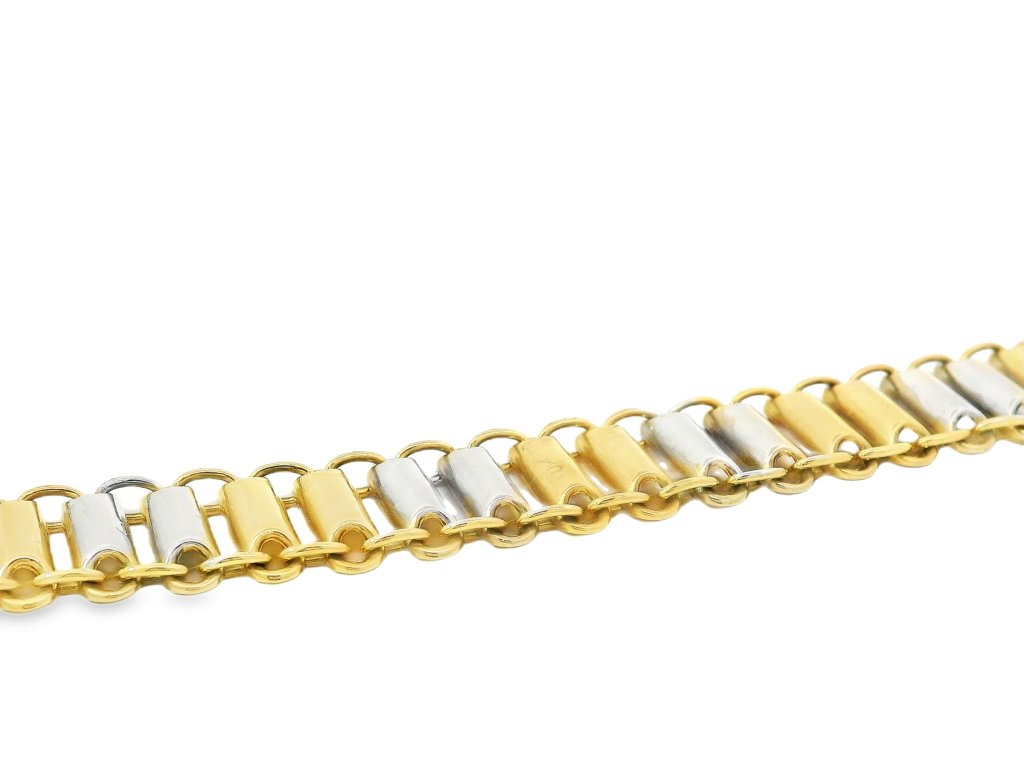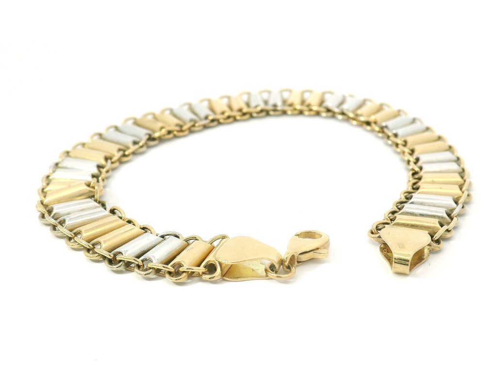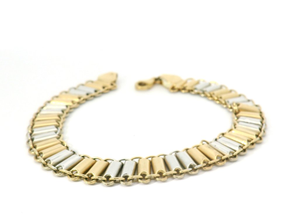 Náramok je vyrobený zo 14-karátového zlata (585/1000) – kombináciou žltého zlata a bieleho zlata s rhódiovaným povrchom. Články sú pevne prepojené tak, aby tvorili pružnú a hladkú líniu bez rušivých prechodov. Biele zlato má jemný lesk a pôsobí elegantne, zatiaľ čo žlté zlato pridáva šperku teplý, tradičný nádych. Povrchová úprava zabezpečuje vysokú odolnosť proti poškriabaniu a dlhodobý lesk. Zapínanie je pevné, bezpečné a diskrétne ukryté medzi článkami.