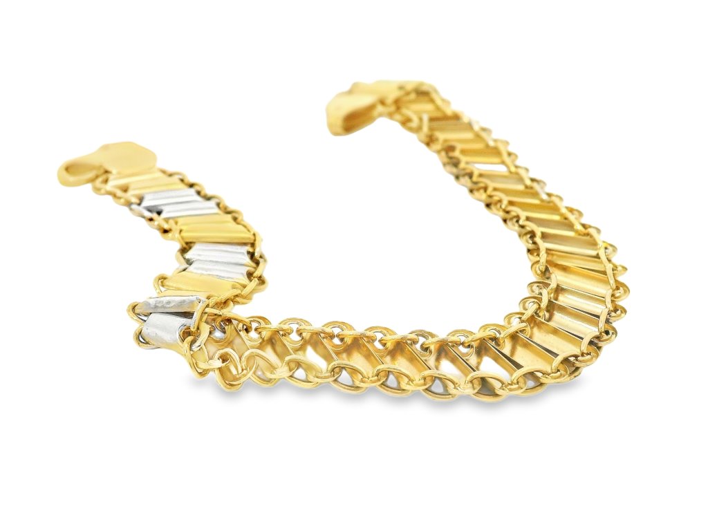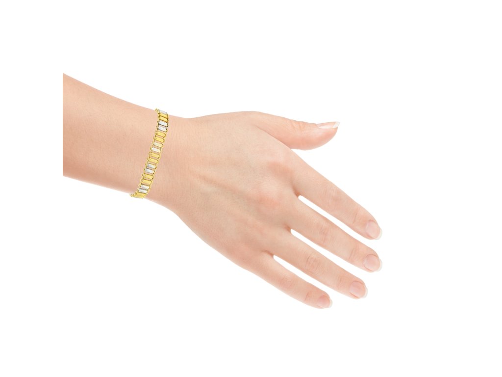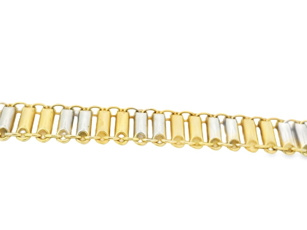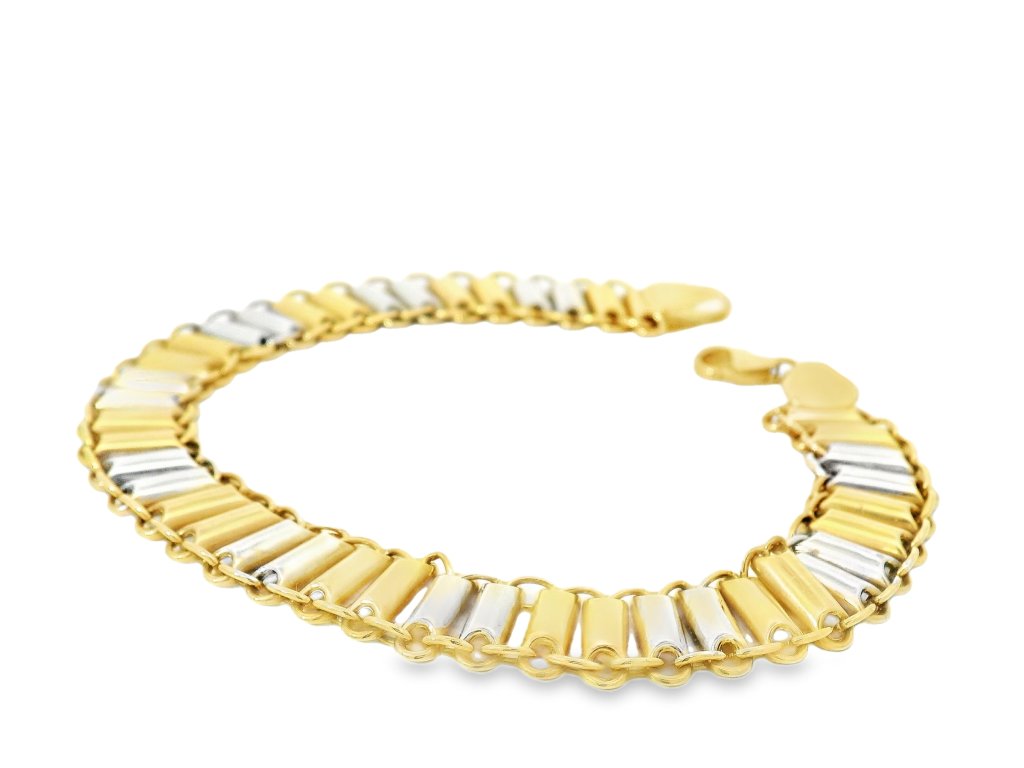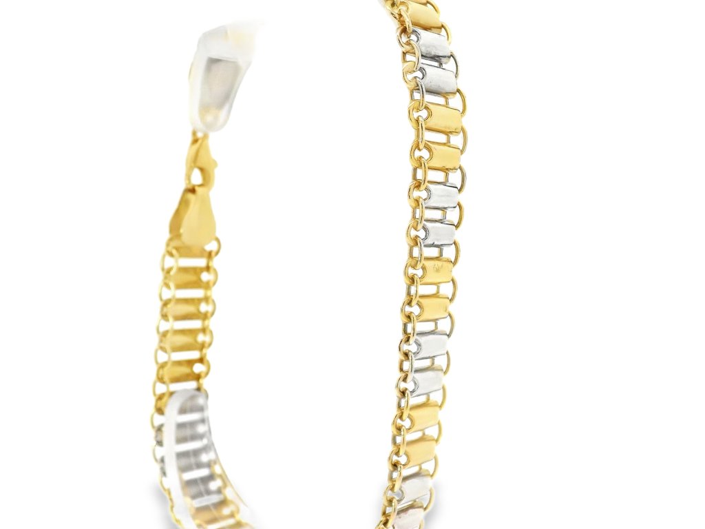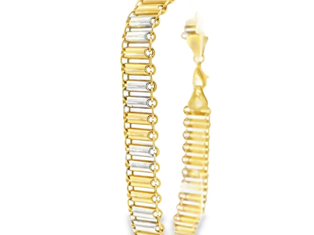 Náramok je vyrobený zo 14-karátového zlata (585/1000) – kombináciou žltého zlata a bieleho zlata s rhódiovaným povrchom. Články sú pevne prepojené tak, aby tvorili pružnú a hladkú líniu bez rušivých prechodov. Biele zlato má jemný lesk a pôsobí elegantne, zatiaľ čo žlté zlato pridáva šperku teplý, tradičný nádych. Povrchová úprava zabezpečuje vysokú odolnosť proti poškriabaniu a dlhodobý lesk. Zapínanie je pevné, bezpečné a diskrétne ukryté medzi článkami.