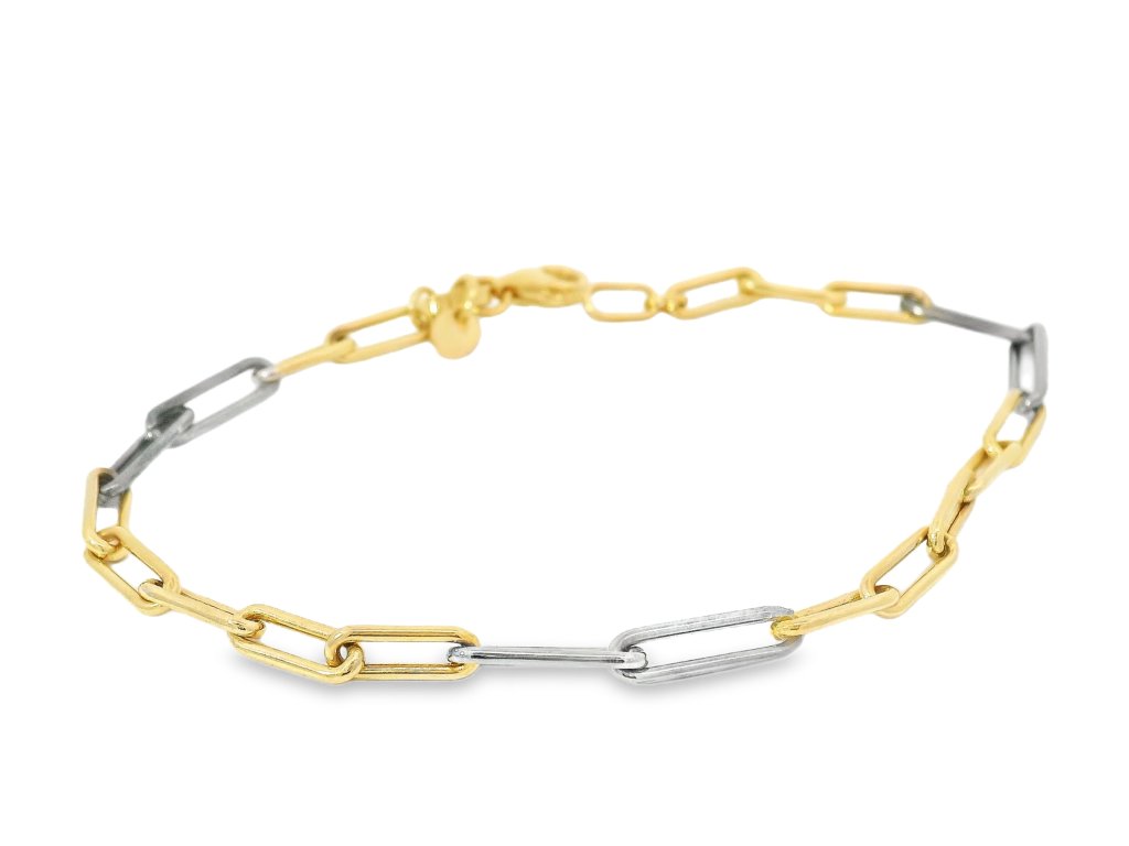 Náramok je vyrobený zo 14-karátového zlata (585/1000), ktoré je známe svojou odolnosťou a ušľachtilým vzhľadom. Lesklé články sú zo žltého zlata, zatiaľ čo tmavé časti sú upravené povrchovou vrstvou čierneho ruténia – exkluzívneho kovu z rodiny platinových kovov. Ruténium dodáva náramku moderný grafitový efekt a zároveň zvyšuje jeho odolnosť proti poškriabaniu. Kombinácia oboch tónov vytvára originálny a výrazný kontrast. Zapínanie je riešené pevnou a spoľahlivou karabínkou.