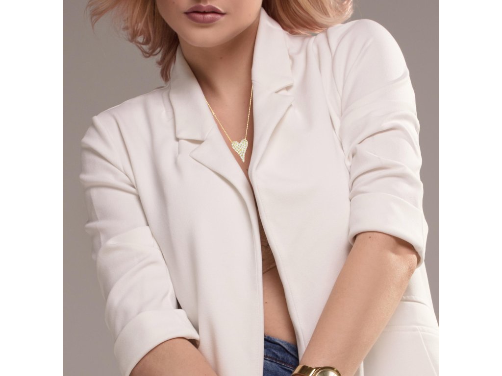 Asymetrické srdce je bohato osadené čírymi zirkónmi, ktoré vytvárajú efekt pavé – trblietavý povrch bez rušivých línií. Zirkóny majú brilantný lesk, ktorý pripomína diamanty, no sú cenovo dostupnejšou alternatívou. Vynikajú vysokou odolnosťou a pri správnej starostlivosti si zachovajú svoj lesk dlhé roky. Ich dokonalé zasadenie zaručuje pohodlné nosenie bez zachytávania. Zirkóny symbolizujú čistotu a večnosť.