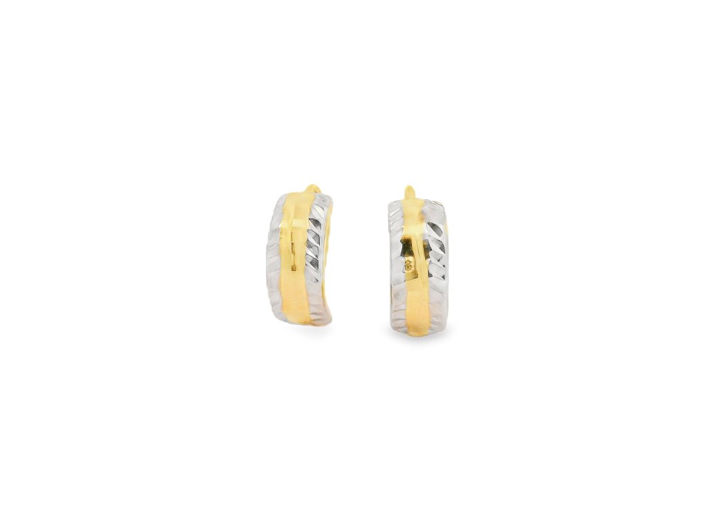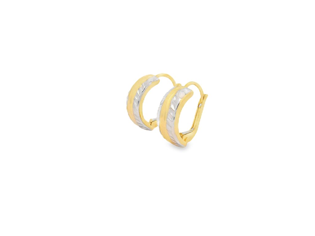 Šperk je zhotovený z 14-karátového zlata (585/1000), ktoré zaručuje jeho trvácnosť a farebnú stálosť. Kombinácia žltého a bieleho zlata pôsobí harmonicky a zároveň dynamicky. Povrchová úprava s rytím a vysokým leskom dodáva náušniciam exkluzívny vzhľad. Vďaka kvalitnému spracovaniu si zachovajú svoj lesk aj pri častom nosení. Precízne opracovanie zaručuje, že každý pár je unikátnym kúskom.
