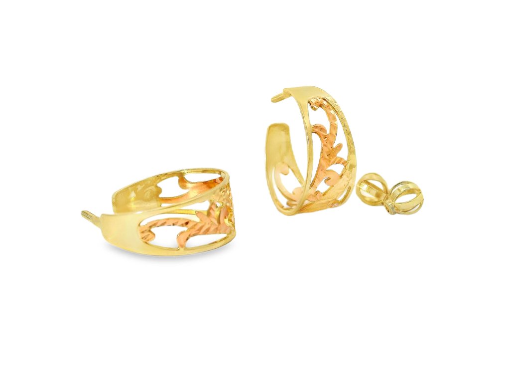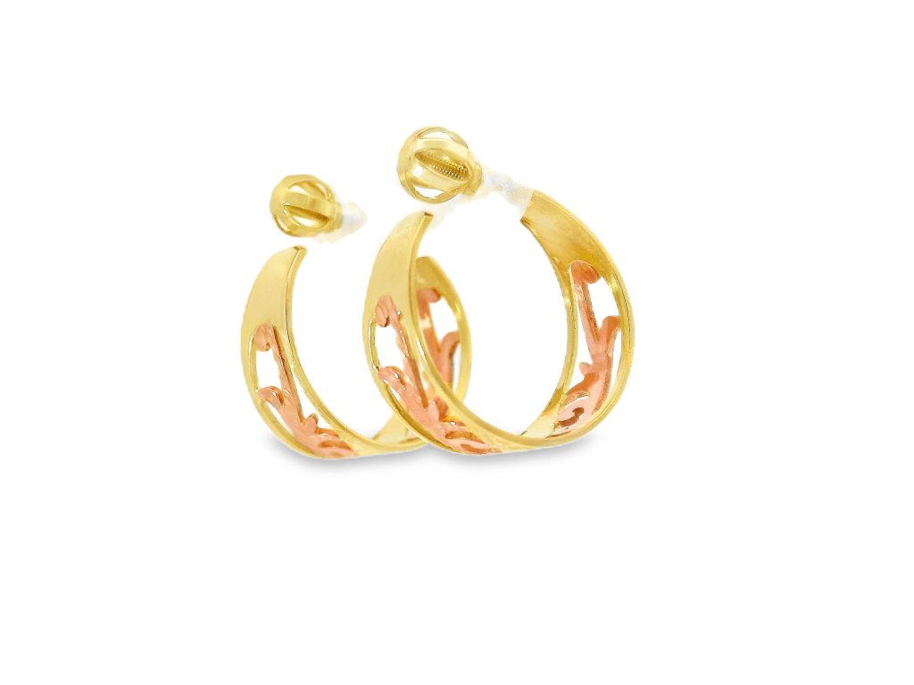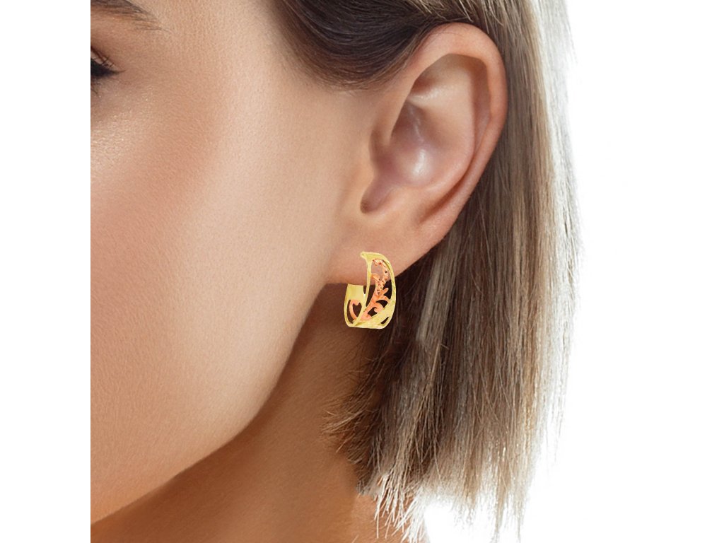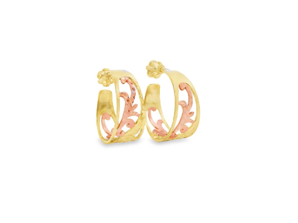 Náušnice sú vyrobené z 14-karátového zlata (585/1000), v kombinácii žltého a ružového zlata. Vonkajší rám je zo žltého zlata s vysokým leskom, zatiaľ čo vnútorný ornamentálny vzor je z jemného ružového zlata. Povrchová úprava zvýrazňuje farebný kontrast aj štruktúru detailov. Šróbovacie zapínanie z rovnakého kovu zaisťuje pohodlie a vysokú bezpečnosť pri nosení. Každý kus prešiel precíznym remeselným spracovaním.