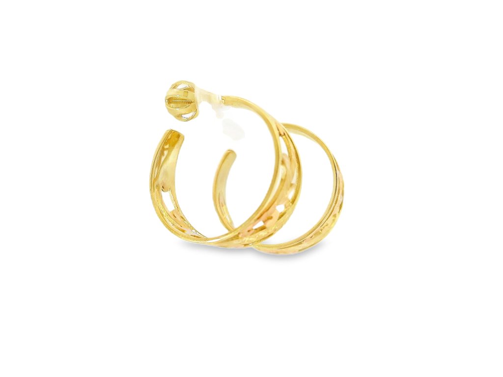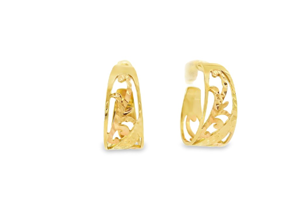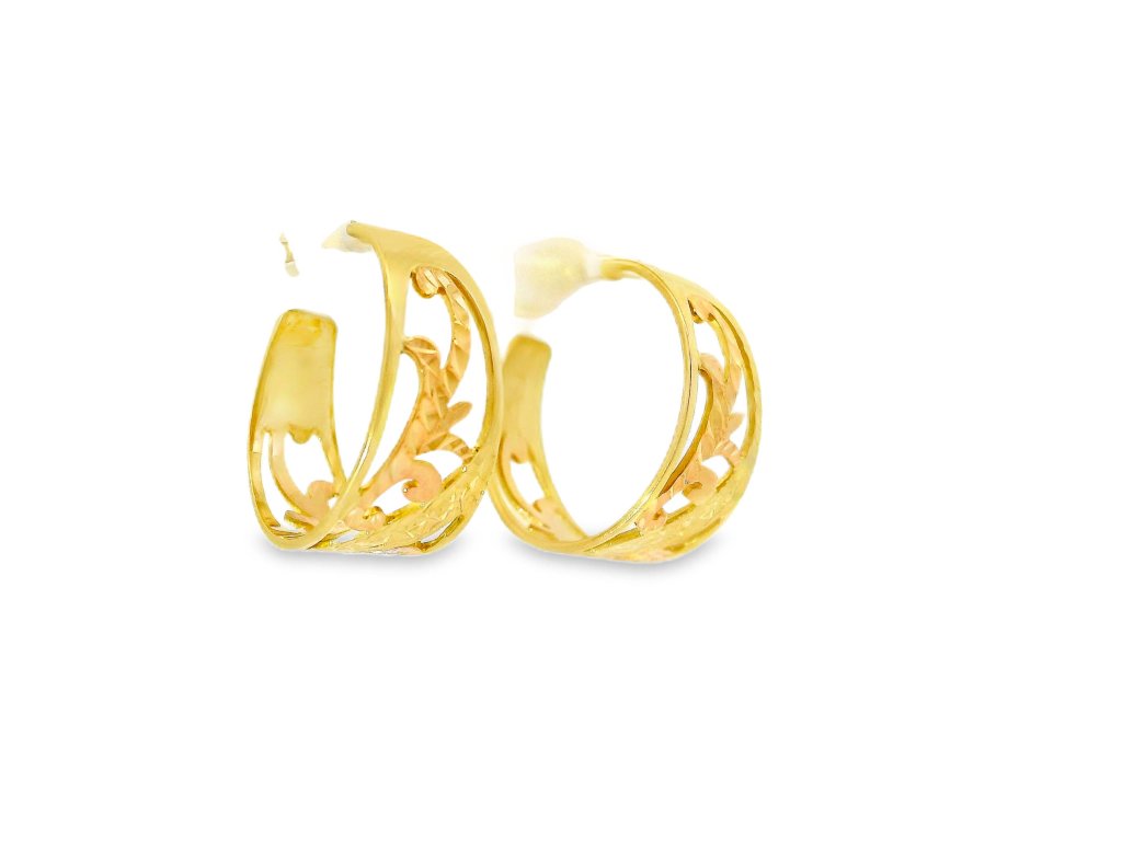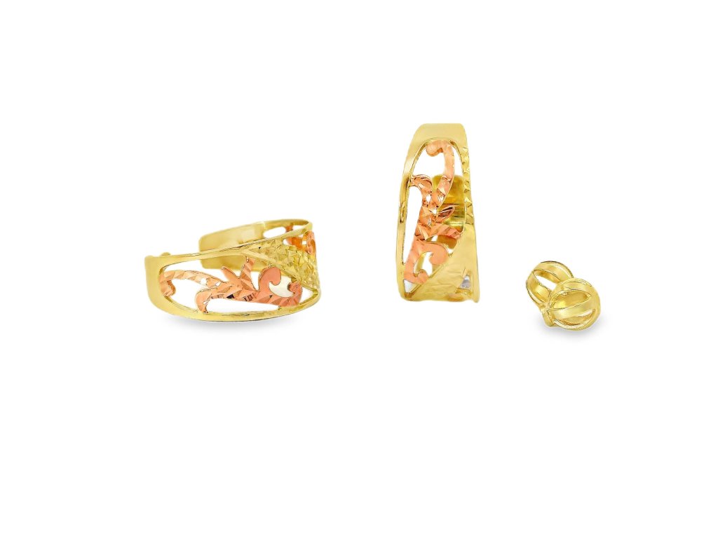 Náušnice sú vyrobené z 14-karátového zlata (585/1000), v kombinácii žltého a ružového zlata. Vonkajší rám je zo žltého zlata s vysokým leskom, zatiaľ čo vnútorný ornamentálny vzor je z jemného ružového zlata. Povrchová úprava zvýrazňuje farebný kontrast aj štruktúru detailov. Šróbovacie zapínanie z rovnakého kovu zaisťuje pohodlie a vysokú bezpečnosť pri nosení. Každý kus prešiel precíznym remeselným spracovaním.