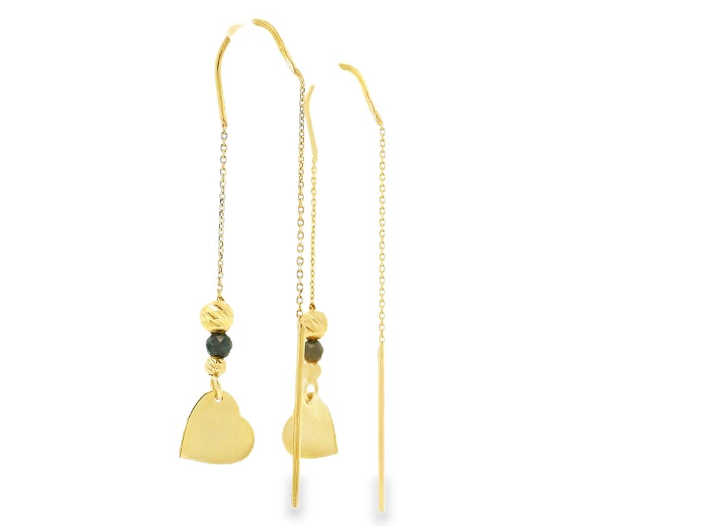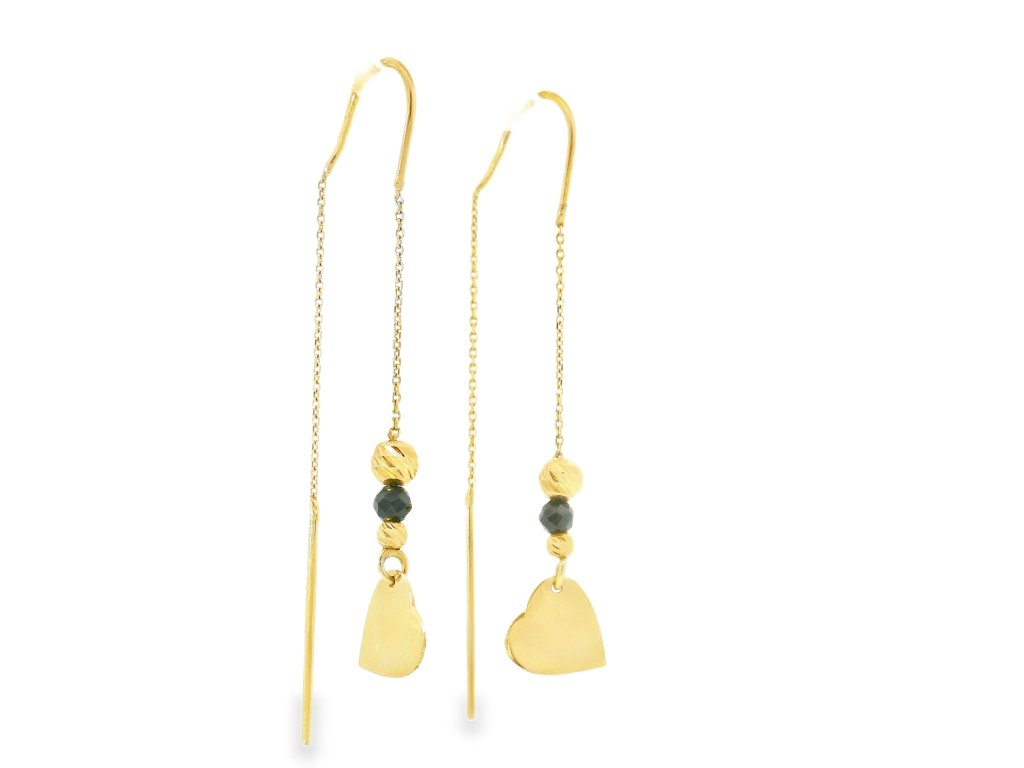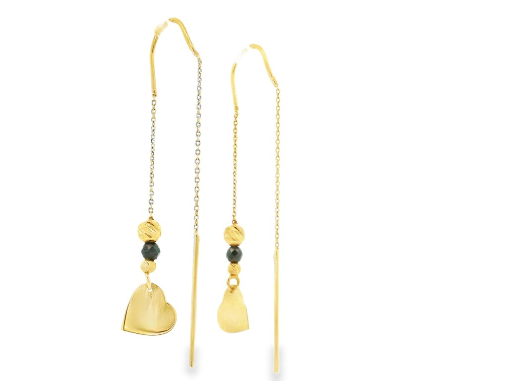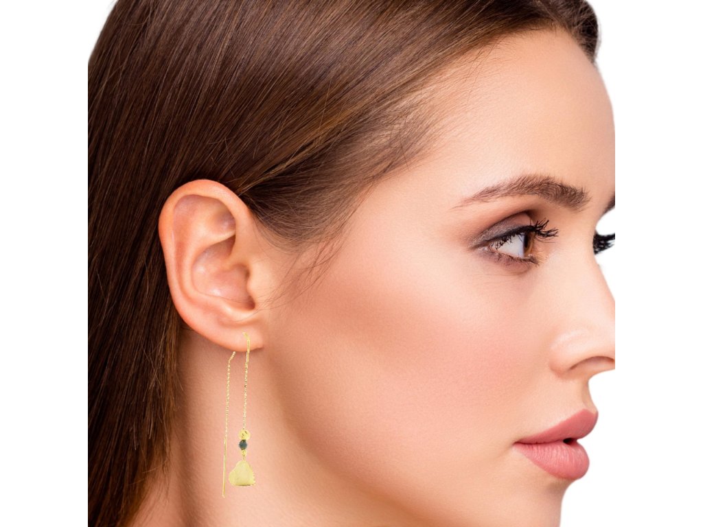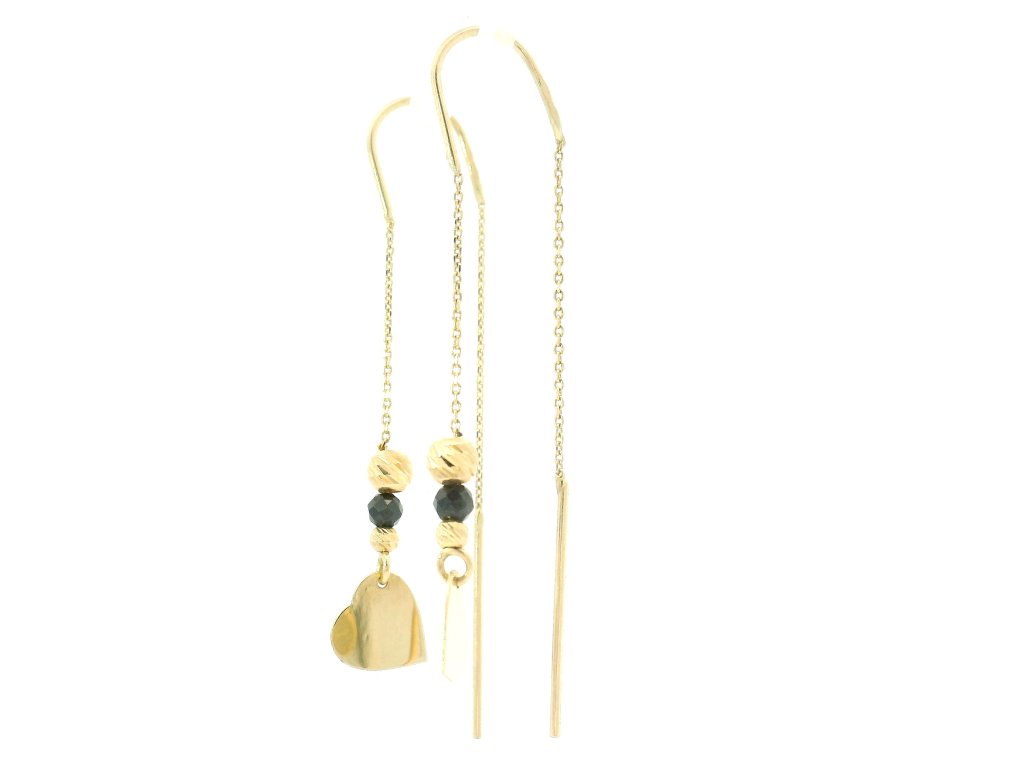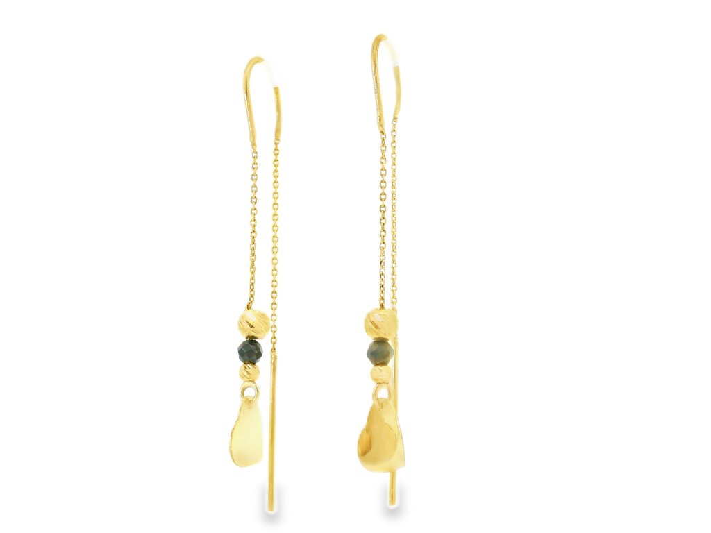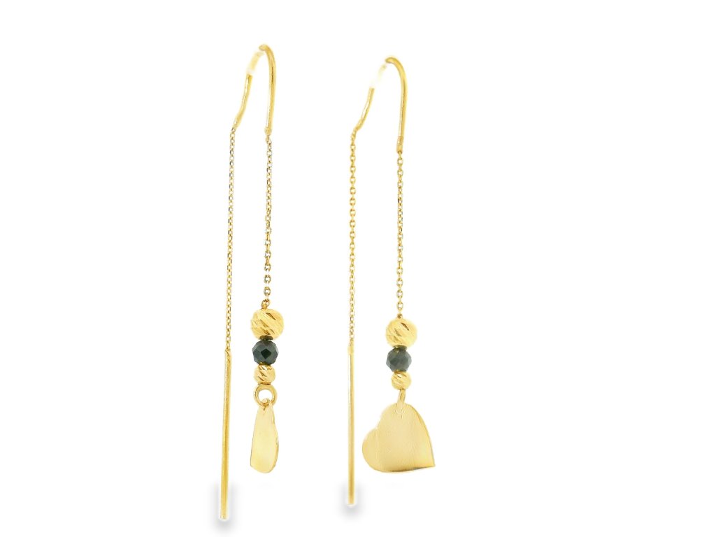 Náušnice sú vyrobené z kvalitného 14-karátového žltého zlata (585/1000), ktoré je známe svojou trvácnosťou a ušľachtilým leskom. Retiazka aj prívesky boli starostlivo vyhotovené s dôrazom na precíznosť a jemnosť. Povrchová úprava kombinuje lesklý a jemne matný finiš, čo šperku dodáva zaujímavú textúru. Retiazkové prevedenie zabezpečuje voľný pohyb náušníc a zároveň ich decentné, ľahké nosenie. Šperk je hypoalergénny a pohodlný aj pri dlhodobom nosení.